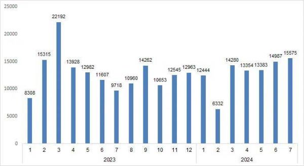 且6月就已创下自去年3月以来的新高,7月更是再上一层,16个月以来首次突破1.5万套。