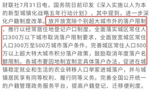 在7月31日,国家层面印发的新型城镇化战略五年行动计划中,已提到放开放宽除个别超大城市外的落户限制。