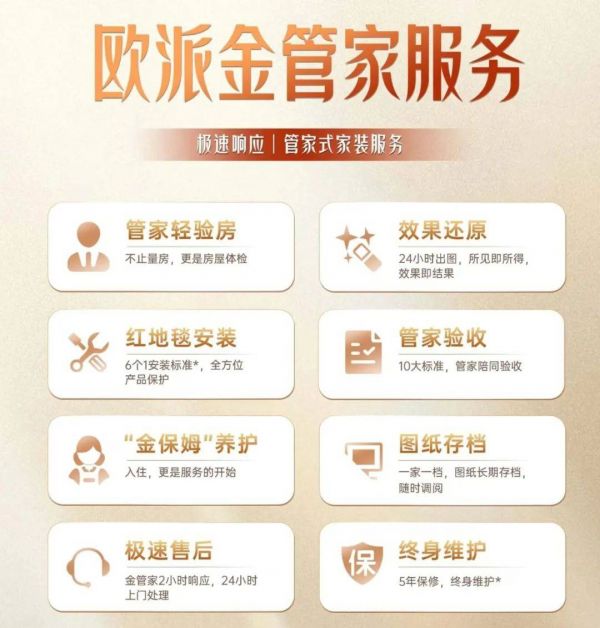 具体举措上,欧派家居今年发布了以“金管家服务”和“黄金会员”为核心的一系列服务升级。所谓的金管家服务包含管家轻验房、效果还原、红地毯安装、管家验收、“金保姆”养护、图纸存档、极速售后、终身维护八项核心服务,为欧派正在深化推进的“定制装修一体化”大家居战略提供更强有力的底层支撑。