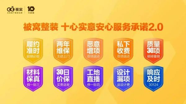 今年,被窝整装”十心实意“安心服务承诺升级。早在2021年9月,被窝整装从费用、质量、工期、服务等维度,推出“十心实意”安心服务承诺,明确家装服务标准。本次服务升级,被窝主要针对装修质量不过关、家装服务延迟、售后保障不到位等频次高、风险大的核心痛点。