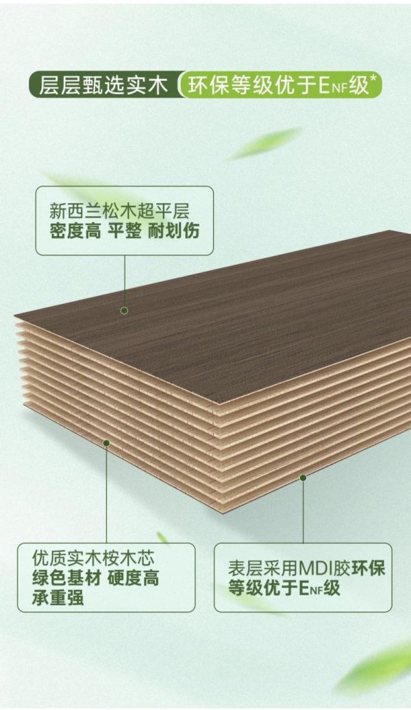 其次,太子家居深切明白家居环境对于健康的重要意义,所以持续以更为严苛的家居环保标准,守护居住者的健康。太子家居不断创新探索,2024年,推出太子家居ENF抗菌多层实木板。精选天然基材,新西兰松木表层配以桉木内芯,采用MDI环保胶,确保材料源头绿色。创新净醛饰面专利技术,持续分解甲醛,绿色环保更安心。
