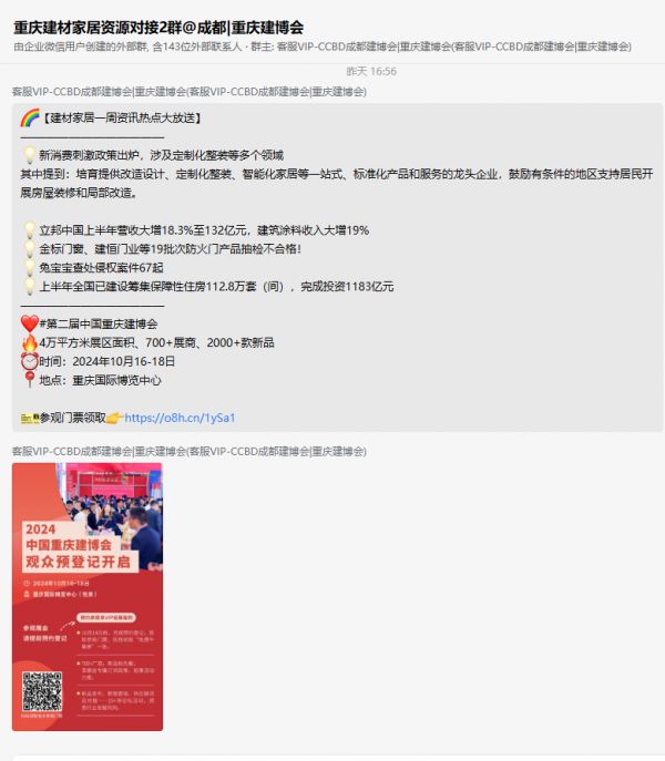 组委会致力于打造人气旺盛、质量上乘的中西部地区大家居建装行业展会,采用多元化的营销策略、创新的邀观方式,全渠道、全方位覆盖推广。2023首届中国重庆建博会共吸引49711万人次全国专业观众到场参观采购,2024中国重庆建博会观众预登记报名通道开启以来,预登记数量持续暴增,总报名人数已远超去年同期,预计超50000人次专业观众到会参观。