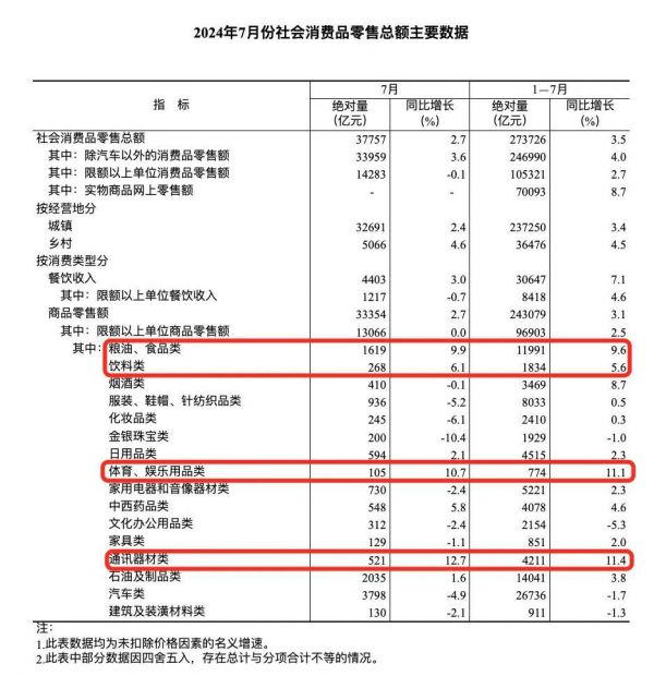 细分来看,基本生活类商品销售较好,比如粮油、食品;另外,体育、娱乐、通讯设备类商品销售较好。
