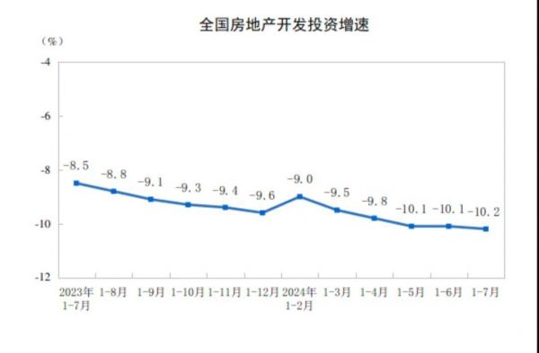 1-7月份,全国房地产开发投资60877亿元,同比下降10.2%;其中,住宅投资46230亿元,下降10.6%。