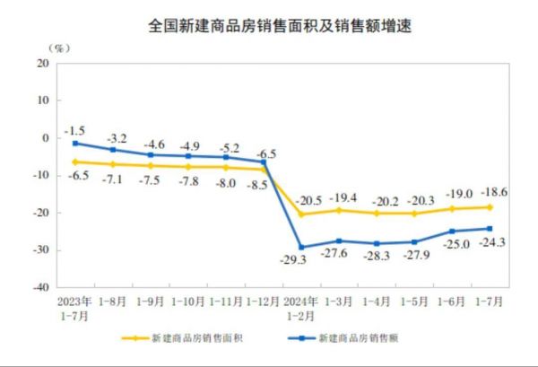 根据统计局数据,1-7月份,新建商品房销售面积54149万平方米,同比下降18.6%,其中住宅销售面积下降21.1%。