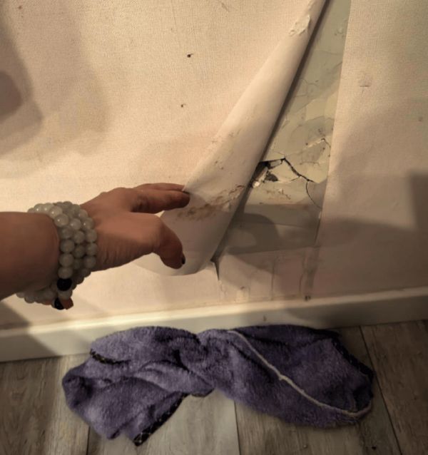 为了了解到底发生了什么,防止更多墙面被水侵蚀,郭女士撕开了壁纸,发现壁纸背后的墙面已经开裂,里面看起来“黑乎乎的”。
