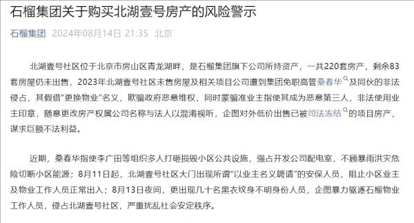 8月14日晚,石榴集团官微发布《关于购买北湖壹号房产的风险警示》(以下简称《警示》)称,2023年北湖壹号社区未售房屋及相关项目公司遭到集团免职高管桑春华及同伙的非法侵占,其假借“更换物业”名义,非法使用业主印章,随意更改房产权属公司名称与法人以混淆视听,企图对外低价出售已被司法冻结的项目房产,谋求巨额不法利益。