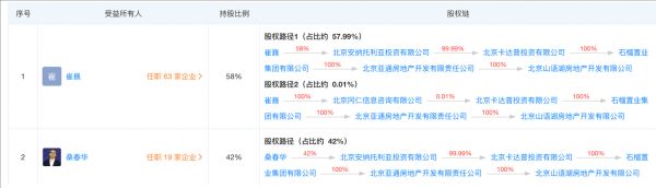 北湖壹号项目公司为北京山语湖房地产开发有限公司,据天眼查,目前崔巍和桑春华分别持有58%和42%股份。