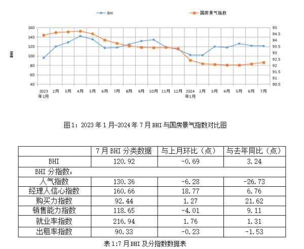 全国建材家居景气指数BHI7月份为120.92,环比下跌0.69点,同比上涨3.24点。全国规模以上建材家居卖场7月销售额为1306.89亿元,环比下跌3.27%,同比上涨8.32%;1-7月累计销售额为8188.69亿元,同比下跌5.84%。