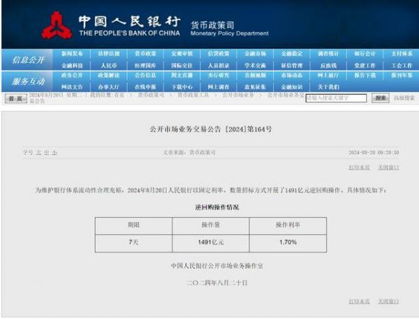 另据央行网站,为维护银行体系流动性合理充裕,2024年8月20日人民银行以固定利率、数量招标方式开展了1491亿元逆回购操作。具体情况如下: