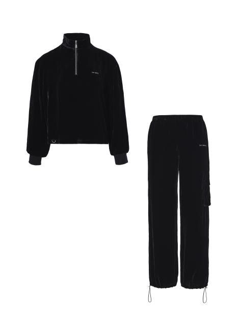 SILKY MIRACLE x YOYOKULALA 系列真丝丝绒套装,甜美中又帶有小男孩般的俏皮感。面料由软糯细腻的真丝丝绒制成,柔软亲肤。甜酷风格的拉链套头衫和丝绒阔腿工装裤,口袋抽绳等细节,结合了运动潮流Sporty chic风格。百搭舒适的同时流露别样时髦休闲风格。