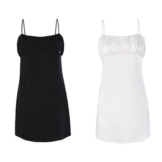 SILKY MIRACLE x YOYOKULALA 系列真丝水晶吊带裙,轻松俏皮。黑白两款迷你吊带裙设计,细腻亲肤有弹力。修身的剪裁,勾勒美好身型。胸部褶皱设计,点缀一颗颗闪耀施华洛世奇小水晶,熠熠生辉间轻启浪漫畅想。