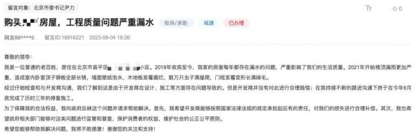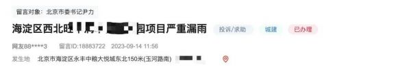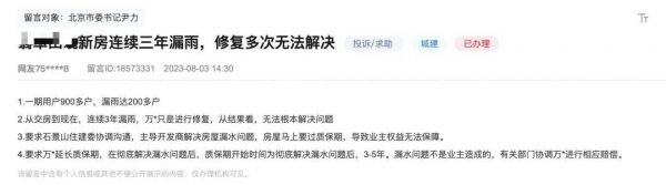 海淀某改善新房被投诉到领导留言板,施工进度滞后半年时间,施工工序不合理,造成室内漏雨积水发霉,严重影响工程质量……
