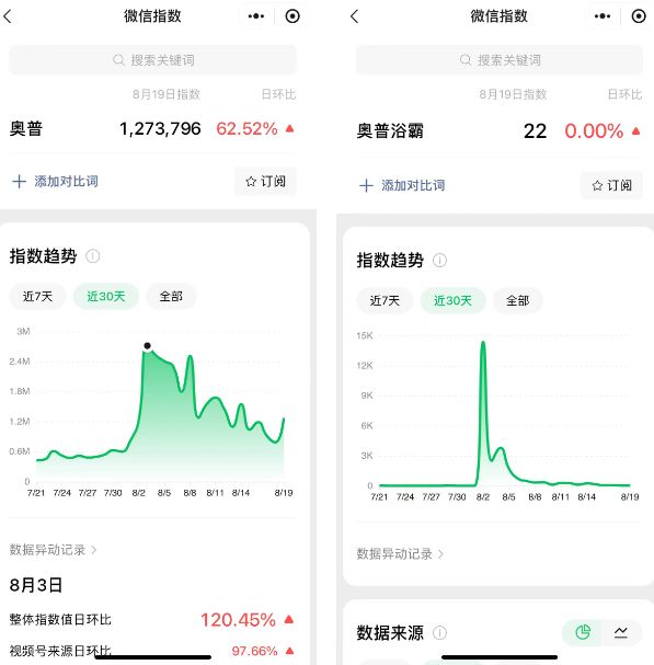 随着潘展乐夺冠的消息传遍大江南北,“奥普”及“奥普浴霸”的微信搜索指数迎来了大幅度上升,直观反映了代言人效应的强大势能。潘展乐作为新晋奥运冠军,其积极向上的形象和卓越的体育成就,成功为奥普品牌注入了新的活力与正能量,帮助奥普进一步扩大品牌影响力和美誉度。
