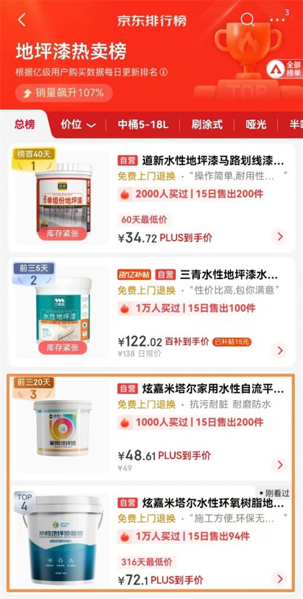 在新品孵化上,基于京东开放的数据分析工具和客户管理系统,炫嘉米塔尔能够深入洞察消费者行为偏好、市场趋势的动态变化,推出更精准匹配消费需求的产品;通过京东小魔方在“搜、推、宣、投”等环节提供的战略资源,炫嘉米塔尔还可以开展多样化的站内站外种草及专项大促,进一步丰富货盘,并以规模效应推动降本增效。比如,针对消费者对地坪漆抗污、耐磨、环保等特质的需求,炫嘉米塔尔联合京东推出了多款高性价比产品,受到消费者热捧,在品类热卖榜上名列前茅。