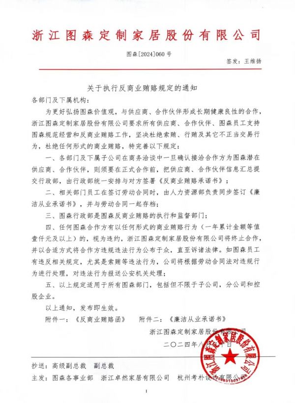 四、任何图森合作方有以任何形式的商业贿赂行为(一年累计金额等值壹仟元及以上)的,视为违约,浙江图森定制家居股份有限公司将终止合作,并以合适方式将合作方违规违法行为公布于众,直至诉诸法律。如图森员工有违反相关规定,尤其是索贿等违法行为,公司将根据劳动合同法对违规行为进行处理,对违法行为报送公安机关处理: