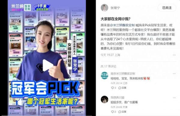 近一个月来,米兰纳“#1平米适我生活赛”的话题不仅引发了女排世界冠军张常宁的关注和点赞,也成为了各大一线媒体持续报道的焦点。米兰纳的“#1平米适我生活赛”话题还吸引了各大品牌和全网达人的关注,不仅有多个品牌微博转发,还有不少达人博主各平台种草,大家纷纷晒出自己心目中的“适我生活方式”,在全网平台引爆了巨大的品牌声量!