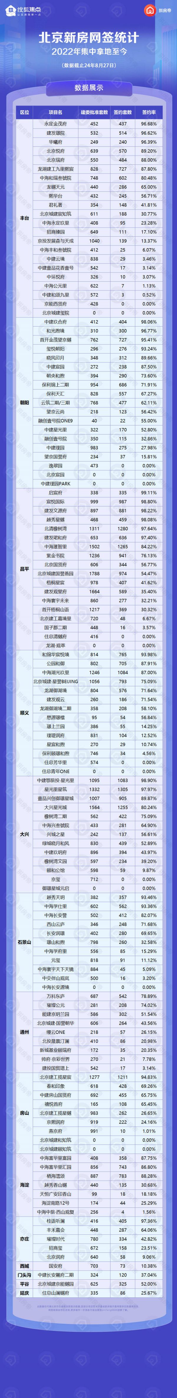 大家买房要考虑的因素有很多,一般包括地段、价格、产品、配套、物业等方面。此外,从数据方面,大家也可以关注一下现在的市场哪些项目卖的好,作为买房时的参考。由此,我们统计了北京各区新房的网签数据,看看各大新房的去化率如何。