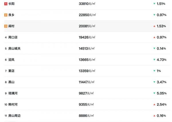 从区域内各板块价格来看,除长阳、良乡、阎村以外,其他多个板块价格已降至1万+,甚至有三个板块直接跌破一万。