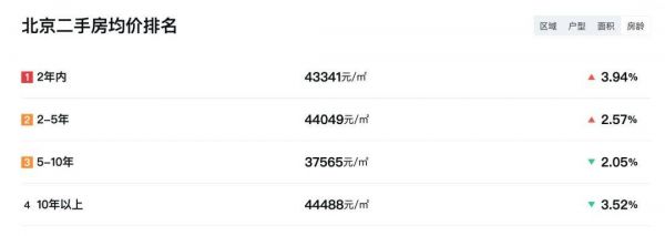 北京二手房均价,楼龄5年以内的新房、次新较5年以上的二手房均价更稳定。