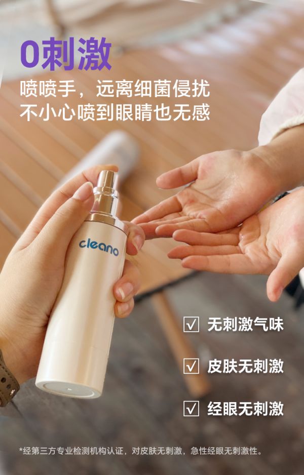 天然成分,温和无刺激。安全性是cleano的一大优势之一。Cleano除菌魔法瓶采用源自欧洲的天然碘提取物作为核心成分,不含酒精、防腐剂等其他添加。这种成分不仅具有卓越的除菌效果,而且温和不刺激。经专业检测机构认证,它对皮肤和眼睛无刺激,且经口无毒。可以放心给孩子喷手除菌,即使孩子在喷手后吃手或揉眼睛也无需担心。每一次的除菌过程,都如同自然界的温柔拥抱,给予孩子最贴心的呵护。