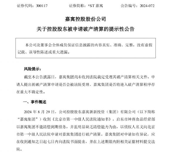 2024年8月30日晚间,*ST嘉寓(300117.SZ)公告称,控股股东嘉寓新新投资(集团)有限公司(以下简称“嘉寓集团”)昨日收到《北京市第一中级人民法院通知书》,启东市坤燕食品经营部以嘉寓集团不能清偿到期债务,并且明显缺乏清偿能力为由,以债权人名义向北京市第一中级人民法院申请对嘉寓集团进行破产清算。嘉寓集团对申请如有异议,应在收到通知之日起七日内向法院书面提出,并在上述期限内附相关证据材料提交法院。