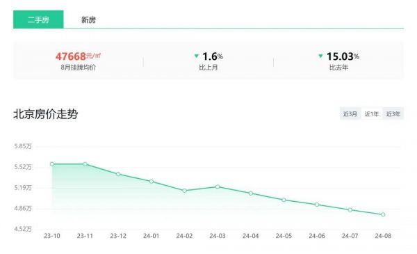 8月北京二手房挂牌均价47668元/平,环比上月下跌1.6%,同比去年同期下跌15.03%。