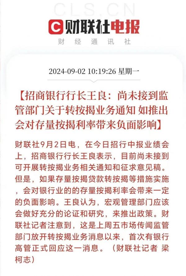 “目前招商银行没有收到监管部门针对个人存量房贷转按揭的相关意见,相关监管部门也并未就此征求过商业银行的意见。”