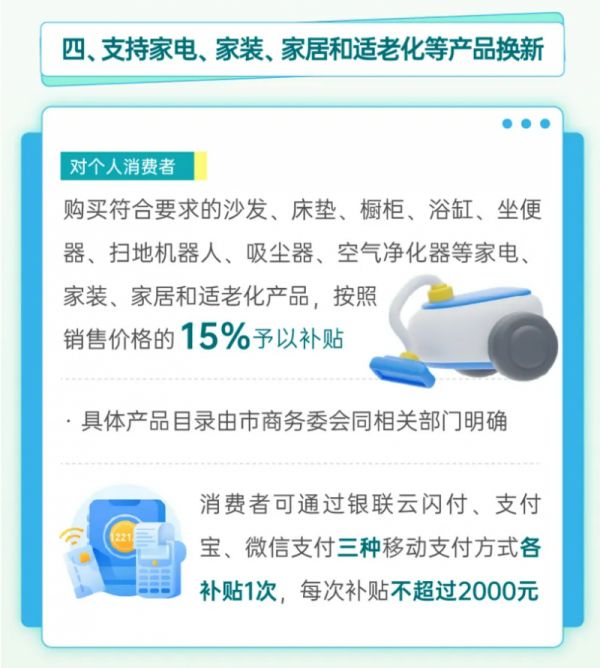 值得一提的是,为了进一步扩大优惠范围,《上海市关于进一步加大力度推进消费品以旧换新工作实施方案》还拓宽了对家电、家装、家居及适老化产品换新支持。对个人消费者购买符合要求的产品,按照销售价格的15%予以补贴,消费者可通过银联云闪付、支付宝、微信支付三种移动支付方式各补贴1次,每次最高补贴2000元。这一举措不仅满足了消费者的多元化需求,也进一步推动了家电家装消费市场的繁荣。
