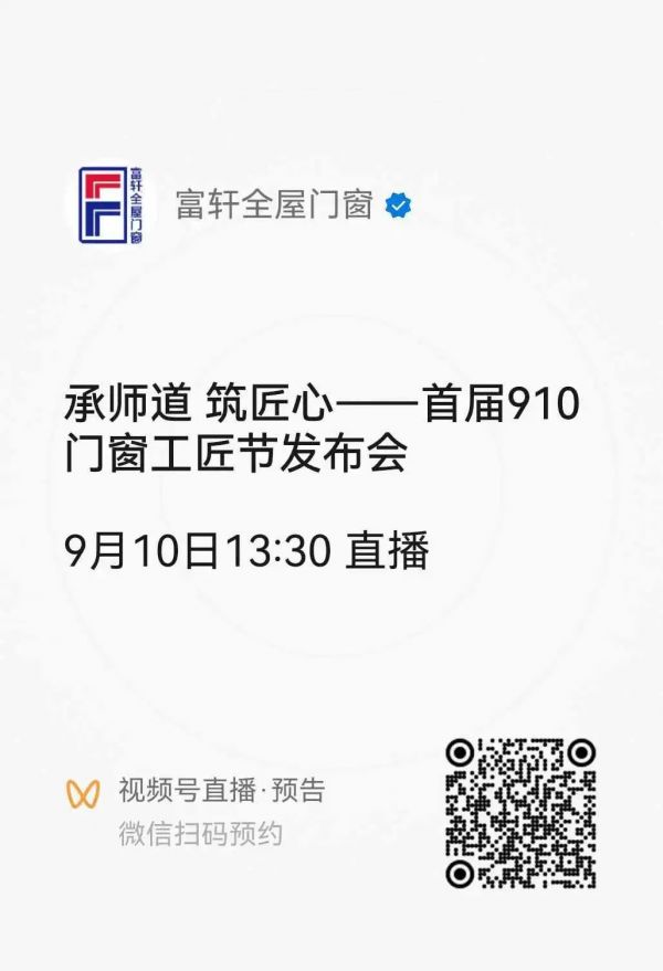 9月10日,敬请关注富轩门窗首届910门窗工匠节发布会!这不仅是一场关于工匠精神的盛会,更是门窗行业未来趋势的风向标。让我们一同见证,匠心如何点亮未来,携手共创辉煌!