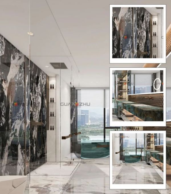 比如在「质感雅苑」空间套餐中,他就特意选择在主卫空间地面通铺冠珠韶华-日上东方岩板,明亮的色彩,还有富有深意的产品寓意,象征着光明与希望,也在无形中赋予居住者积极向上的生活态度。