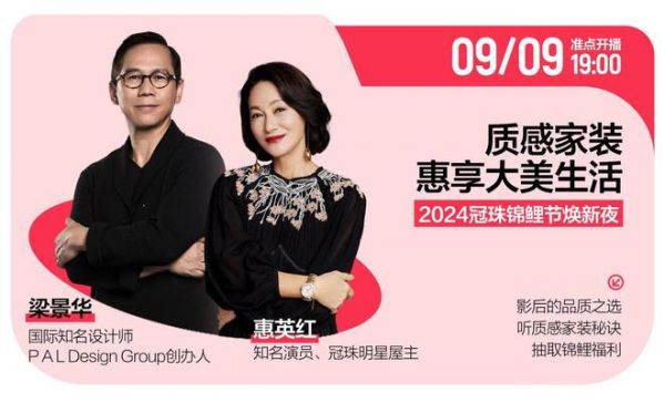9月9日晚19:00,冠珠瓷砖也将继续携手人民日报发起“2024冠珠锦鲤节焕新夜”直播活动,为大家带来更多实惠的锦鲤家装福利。届时,知名演员、冠珠明星屋主惠英红,国际知名设计师、PAL DESIGN GROUP创办人梁景华将亲临冠珠直播间,分享家装心得,敬请期待!