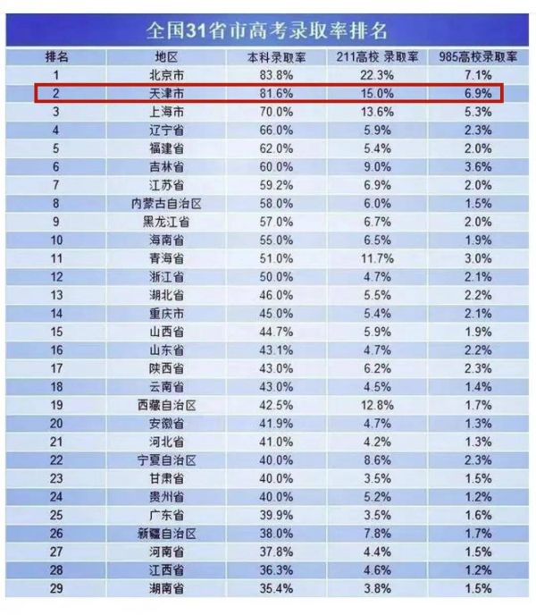 天津2023年本科录取率81.6%,985录取率6.9%,211录取率15.0%。