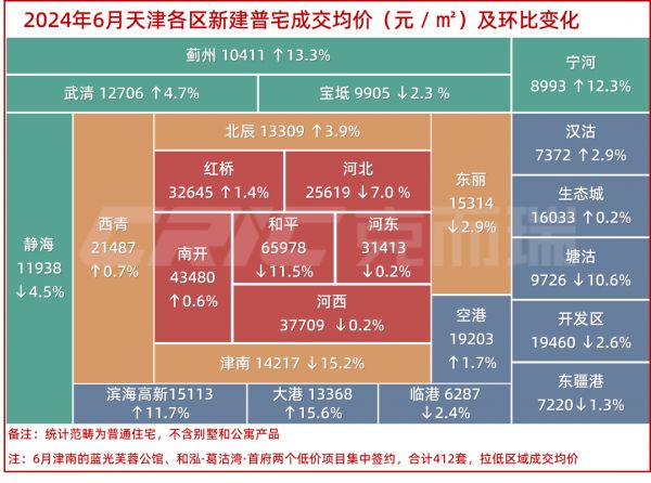 而六月,天津的商品住宅市场备案均价稳固在18872元/㎡水平。宝坻、宁河、汉沽等区域的均价在1万以内。