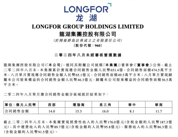 9月9日,龙湖集团控股有限公司(00960.HK)发布了2024年8月未经审核的营运数据。