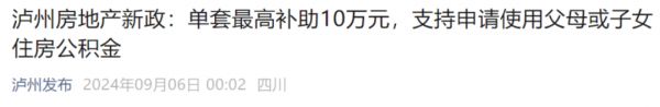 9月6日,“泸州发布”微信公众号发布了《关于进一步促进房地产市场平稳健康发展的政策措施》。