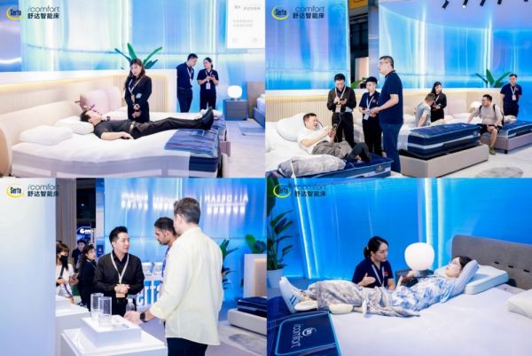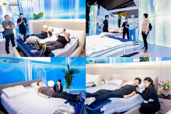 展会首日,全国的合作伙伴、参观者纷至沓来,齐聚舒达展馆。在智能床体验区,来宾悠然躺卧于舒达2024年最新款智能床上,体验娱乐休闲、舒压按摩、一键哄睡、温柔唤醒等功能,并尝试用APP操控调试智能床,体验结束后查看自己的试睡报告。