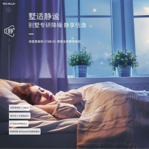 同时,YES-VILLA+系列拥有AI自适应降噪设计,通过室外机的12个温度传感器、2个压力传感器以及室内机5个温度传感器实时监测、实时校核,并实时调整室外机风扇转速及压缩机运转频率,确保能力输出精细化匹配,让舒适性与静音体验二者兼得。