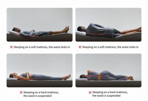 传统材料床垫的固定结构,无法适应不同睡姿下的颈腰椎的不同生理曲度。而研究表明,人在夜间的睡姿会发生数十次变化,而不同睡姿的身体曲线不同,一个枕头及传统床垫无法自动整夜适应其变化。并且大多的传统床垫往往过于柔软或过硬,前者无法提供足够的支撑,后者则可能导致局部受压过度,两者均不利于脊椎与睡眠健康。