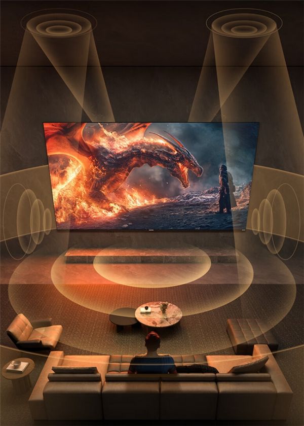 如今市面上的电视,大多采用左右声道,高端一些的会加上重低音,形成2.1声道。然而,由于电视尺寸和音响位置设计的局限性,扬声器空间小,音质受到极大限制,难以提供真正的立体声体验。这也导致很多人不得不外接回音壁或音响来提升音质和观影沉浸感,但随之而来的是占用空间、外接线影响美观以及搭配难题。