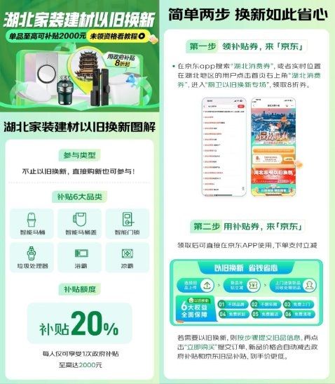 今年以来,全国多地发布和升级消费品以旧换新政策、补贴,其中湖北省斥资3.5亿元补贴家电家居以旧换新,满足旺盛的市场消费需求。近日,京东携手湖北省政府,针对湖北地区发起家装建材以旧换新专项活动,补贴范围覆盖智能马桶、智能门锁、智能马桶盖、垃圾处理器、浴霸、凉霸六大品类。每位湖北人打开京东APP搜索“湖北消费券”,均可领取1次8折补贴券,单品至高可省2000元!值得一提的是,不止以旧换新家庭可领取补贴,湖北消费者直接购新也能参与其中,享受实在的价格减免。