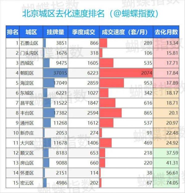 有机构根据北京现在挂牌量和成交速度,测算了北京各区二手房去化周期。