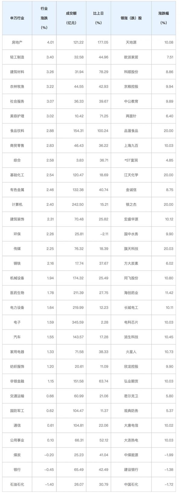证券时报•数据宝统计,截至上午10:28,今日沪指涨0.94%,A股成交量353.39亿股,成交金额2959.29亿元,比上一个交易日增加30.30%。个股方面,5051只个股上涨,其中涨停56只,268只个股下跌,其中跌停7只。从申万行业来看,房地产、轻工制造、建筑材料等涨幅最大,涨幅分别为4.01%、3.40%、3.26%;石油石化、银行、煤炭等跌幅最大,跌幅分别为1.40%、0.45%、0.20%。
