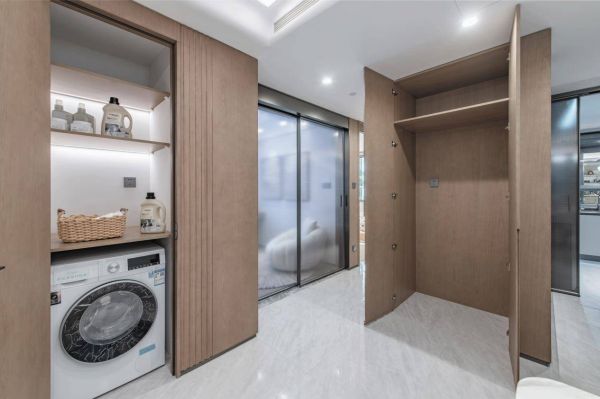 对于日常家务的洁净处理,隐蔽家政间的设计提供了创新方案。客厅区的家政间,科学布局,下层预留了洗衣机位、电源插座、水管接口和排水口,上层则用于存放洗衣液等清洁用品。隐蔽式设计,既保留了家居的整洁性,又使家务操作更加便捷,不会干扰其他家庭成员的日常生活。