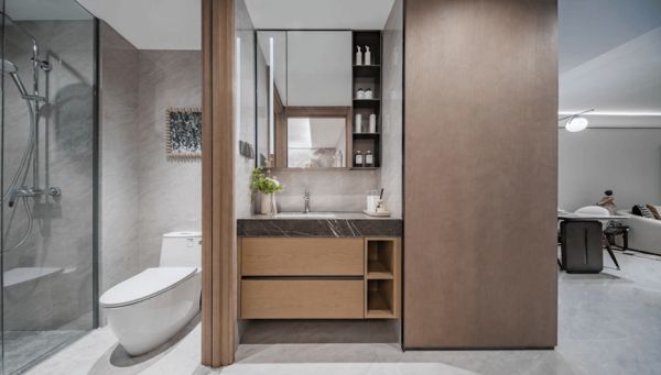 建面约96㎡三居户型配置全明双卫,大幅提升了居住的舒适度和空间利用率。干湿分离设计,有效防止水汽扩散。客卫三段式布局实现了洗漱、淋浴和如厕的独立分区。开启式镜柜、底部卫浴柜和抽屉的收纳组合,提供了充足的存储空间,方便日常物品的分类归置,整体提升了卫浴空间的整洁度与便利性。