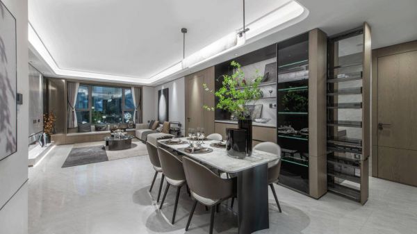 在餐厅区域,中建星光里建面约96㎡三居通过设计一体化餐边柜系统,进一步提升了收纳功能。餐边柜以高颜值与强收纳并存为特点,通过柜体+展示柜的组合形式,增强了储物能力,赋予餐边柜更多的展示功能,进一步拉满餐厅整体的格调与品位。