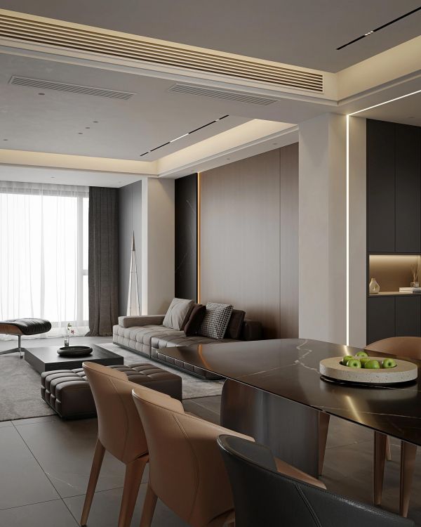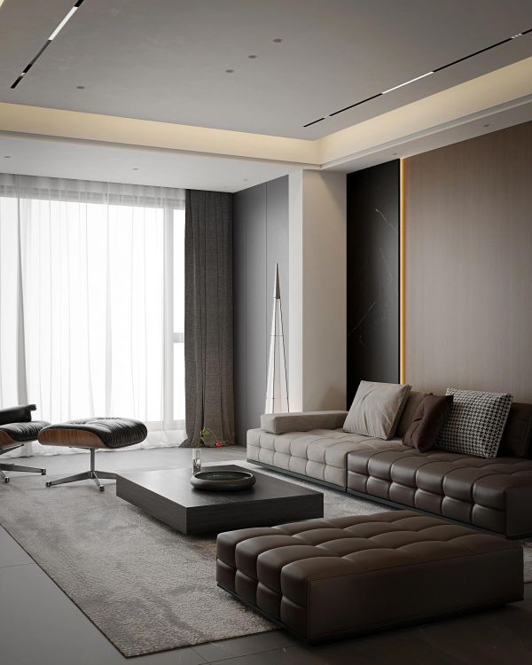 家具布局:中央摆放着一个黑色长方形的茶几,简洁大方,与周围的家具形成了和谐的搭配。沙发区位于客厅的右侧,沙发采用了灰色和棕色的组合,搭配黑色和白色的抱枕,既舒适又时尚。