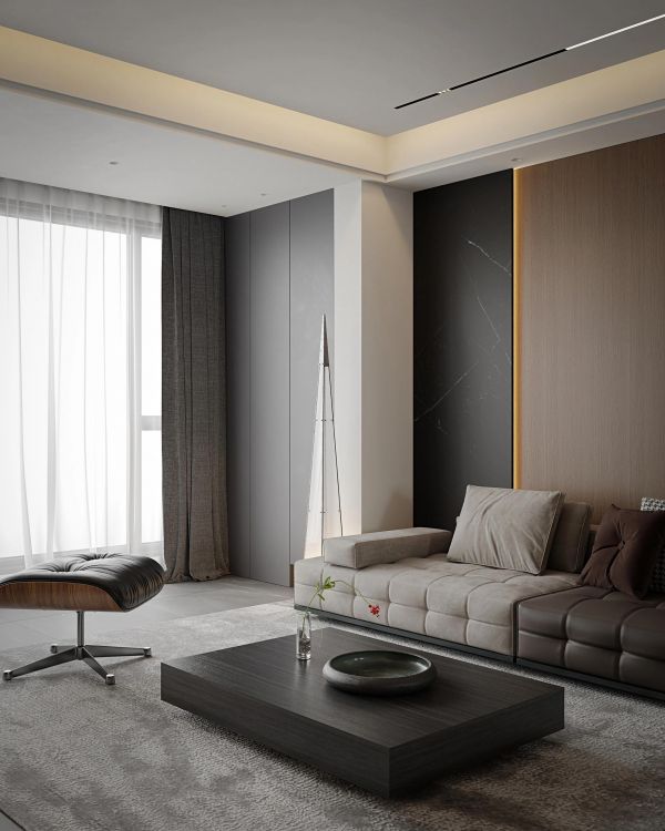 色调与氛围:客厅的色调以灰色和白色为主,营造出一种宁静而舒适的氛围。整个空间的设计简约而不失格调,充满了现代家居的精致与舒适感。