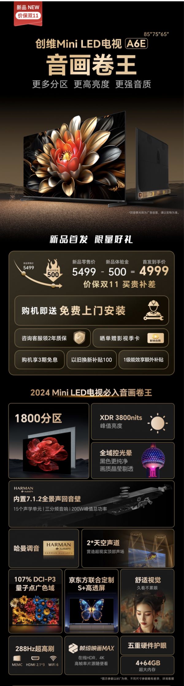 如今,创维 Mini LED电视A6E已经蓄势待发,作为市场上独领风骚的“音画双绝”电视产品,创维A6E无疑将成为众多家庭娱乐爱好者的首选。感兴趣的朋友在9月21日开售当日赶快下单,可享免费安装、延保服务,晒单更有影视季卡相赠。同时,创维提供3期免息支付、以旧换新补贴,助力客户轻松升级。特别惊喜是,支付尾款还有机会赢取限量PS5或《黑神话·悟空》游戏。详情请登录京东、天猫各大电商平台,搜索产品型号查看开售专属权益。