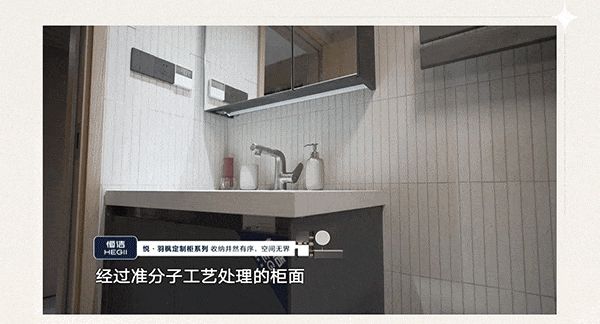 为了加大空间的利用率,设计师在卫生间也为业主选择了专为多口之家打造的悦·羽枫定制浴室柜系列,生态实木多层板,结构稳定性强,坚固耐用,准分子工艺柜面,防潮防水,不易滋生霉菌,沿海地区使用无忧;搭配12mm无缝岩板盆,无缝一体设计,不藏污不纳垢,清洁省心。